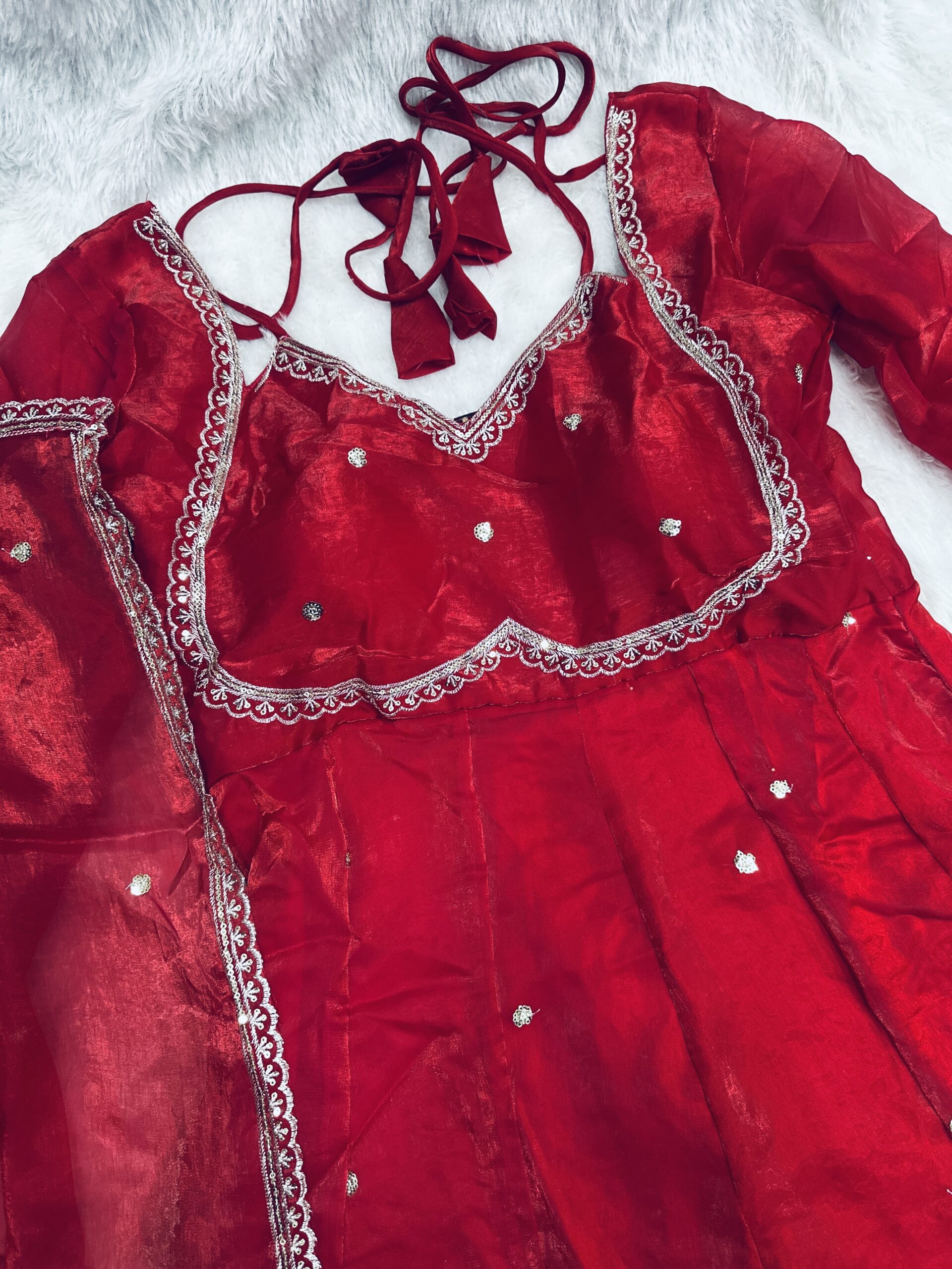 A beautifully stitched embroidery gown crafted in luxurious Fandy silk, enhanced with elegant sequence work and paired with a matching dupatta and bottom. Perfect for festive gatherings, sangeet nights, and ethnic celebrations.