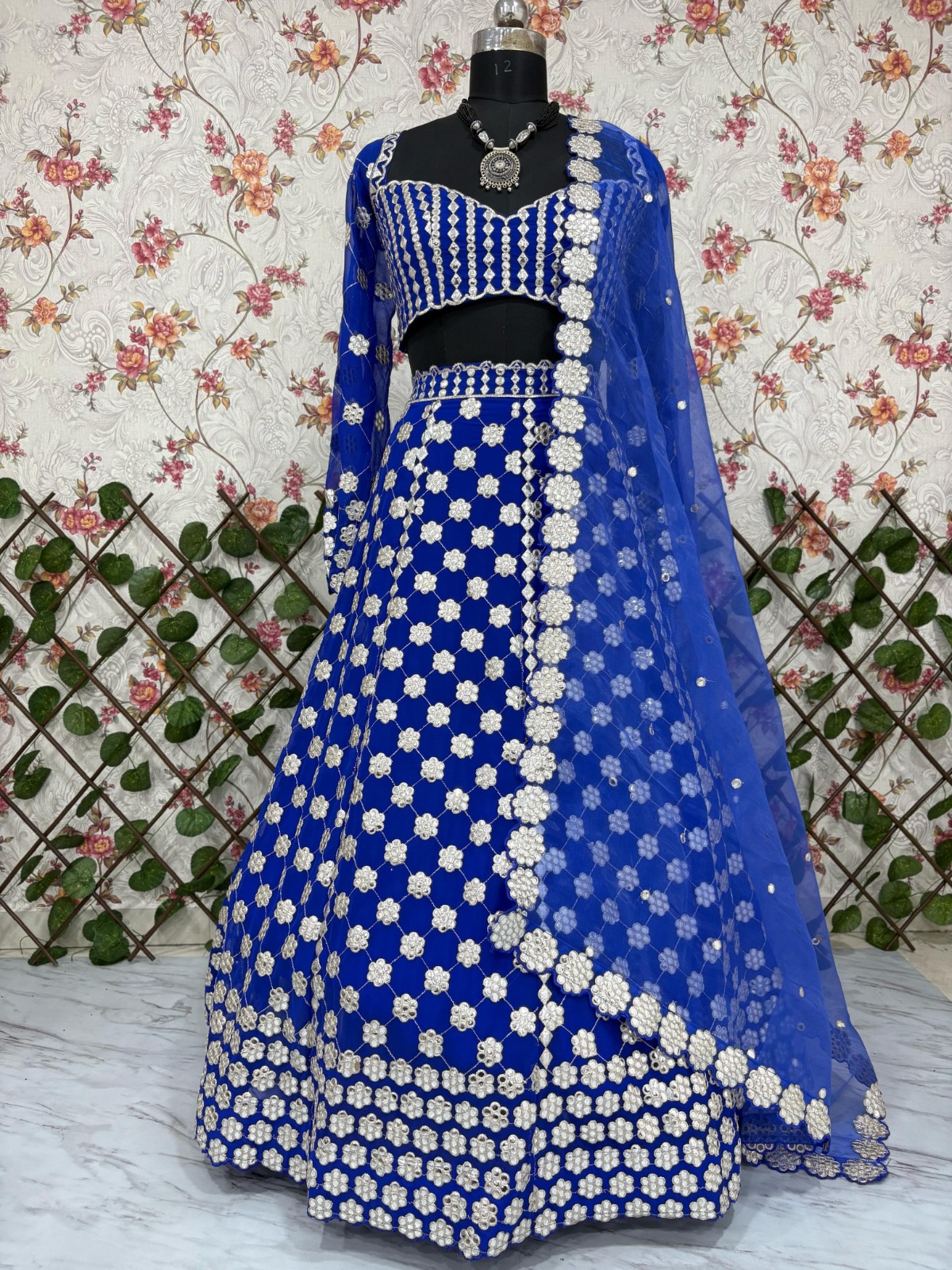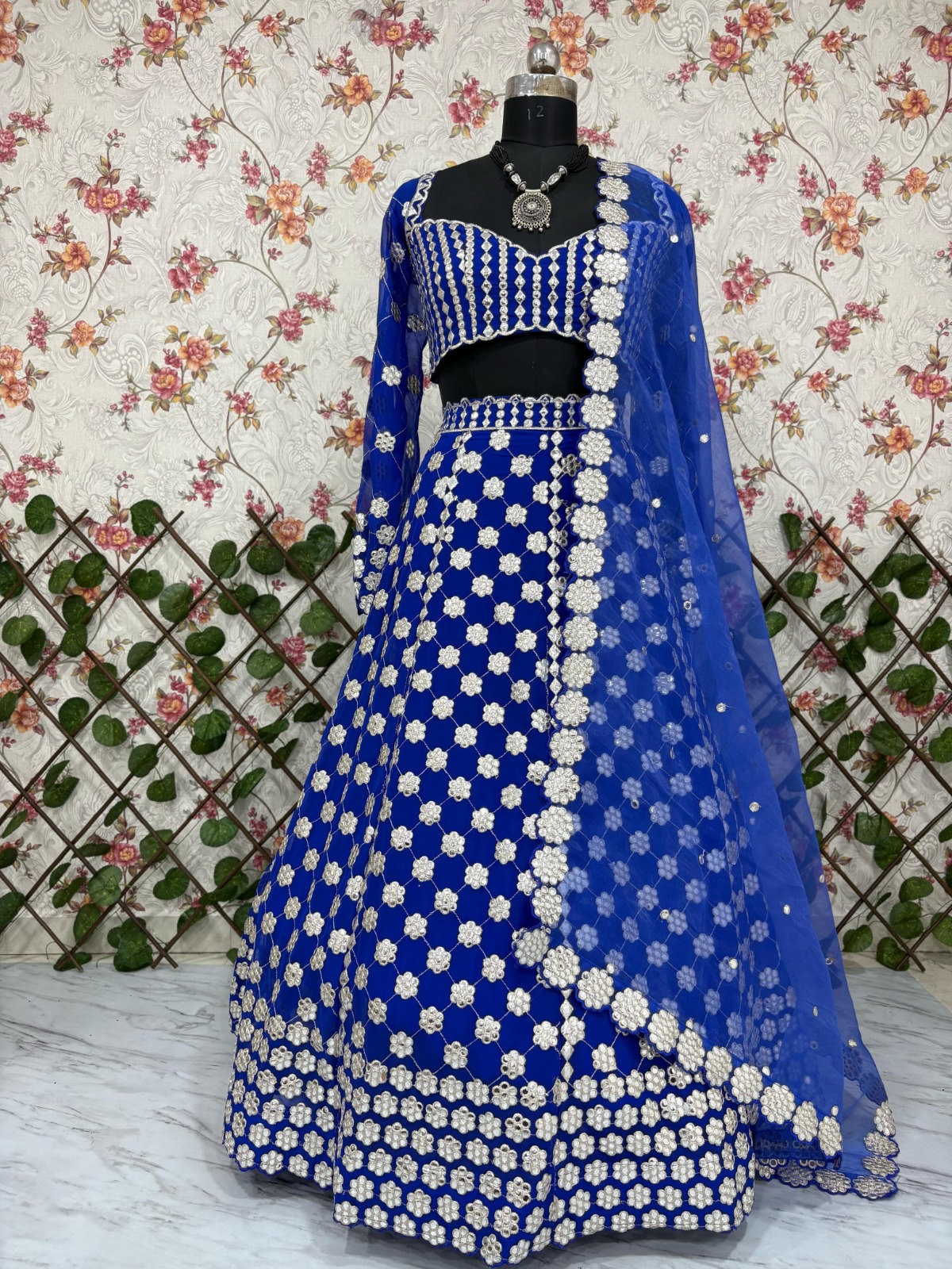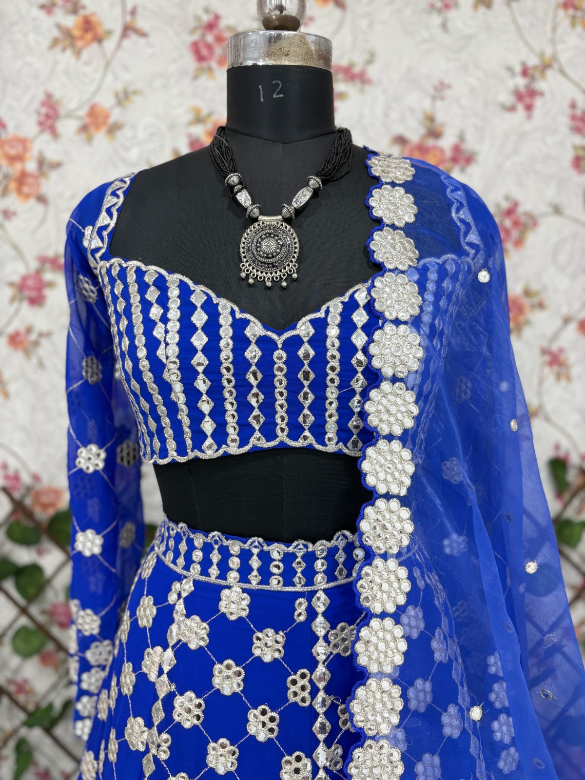 Presenting our most trending designer lehenga collection – HC-1054, crafted in premium georgette with heavy thread embroidery, coding, and foil mirror work.