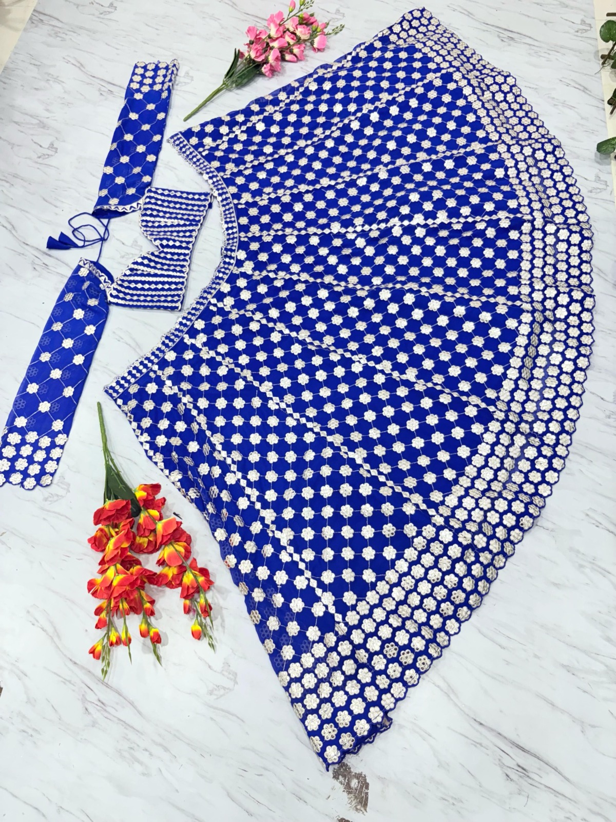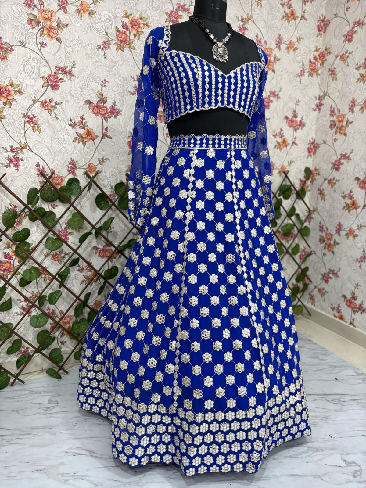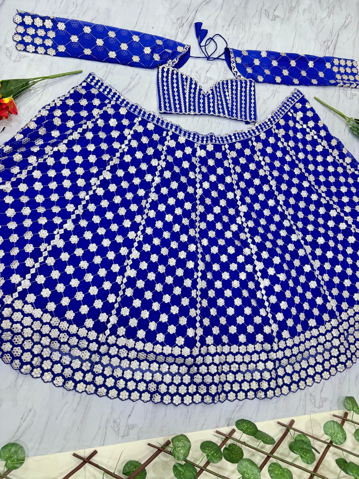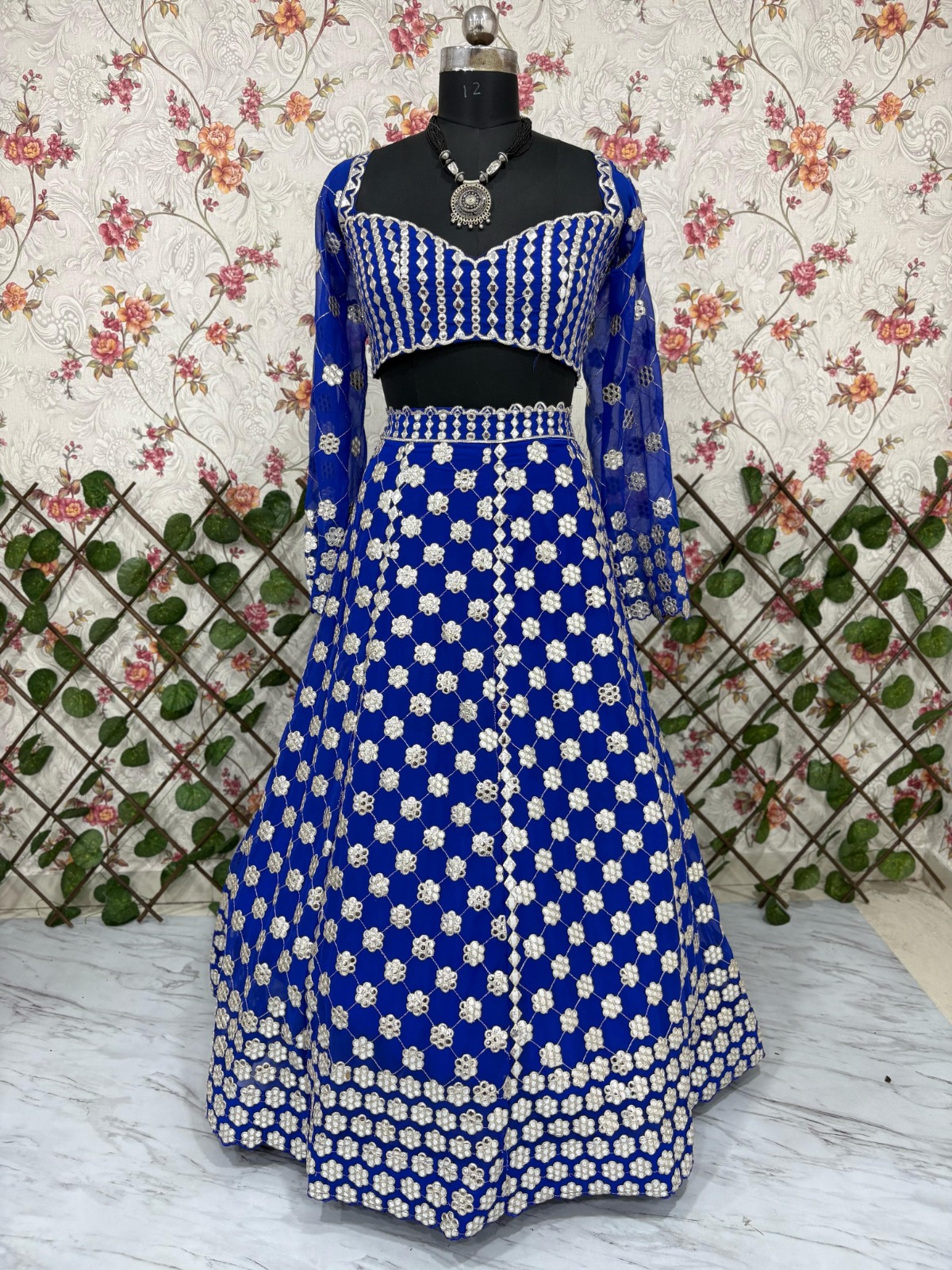 Presenting our most trending designer lehenga collection – HC-1054, crafted in premium georgette with heavy thread embroidery, coding, and foil mirror work.