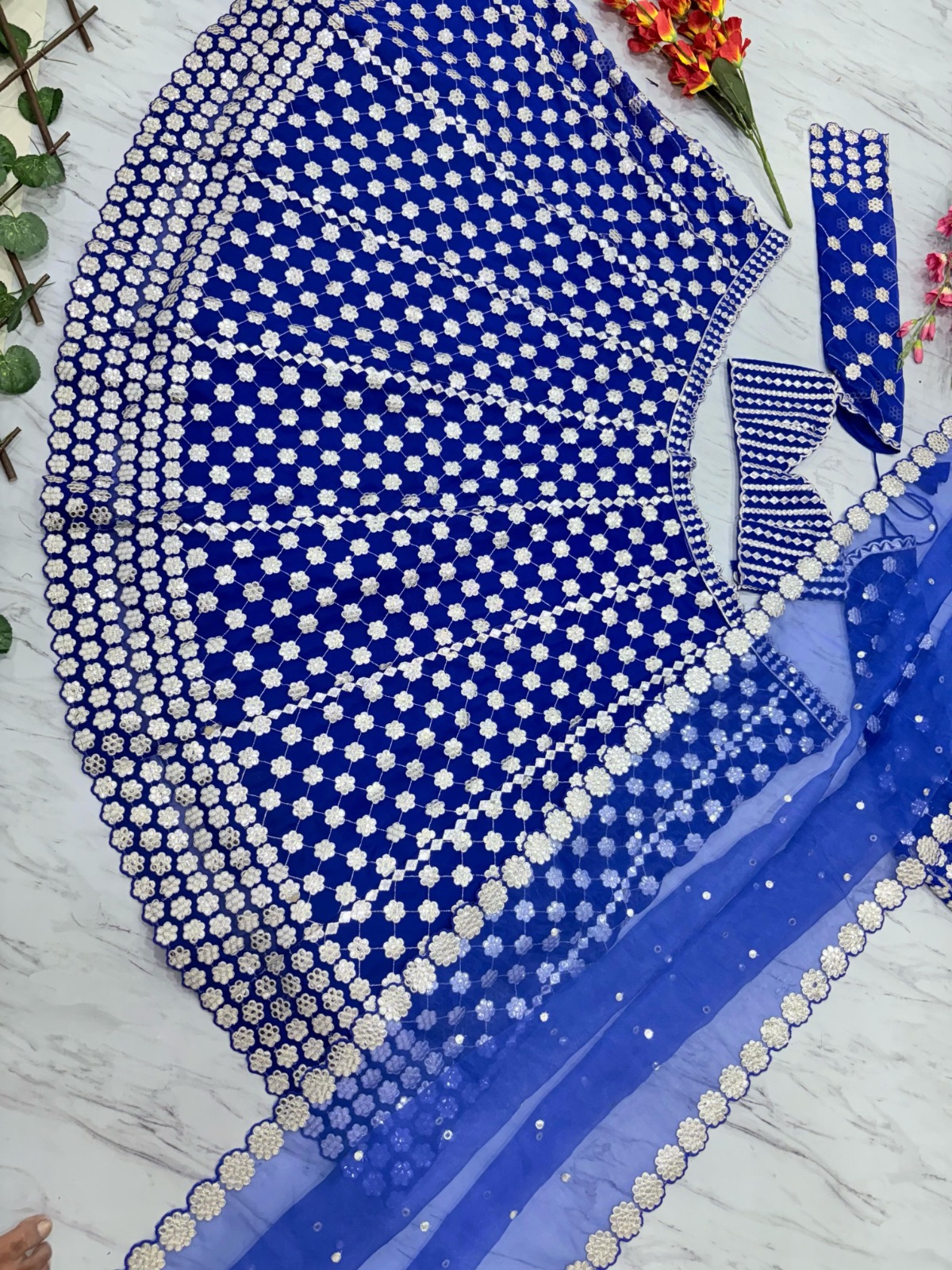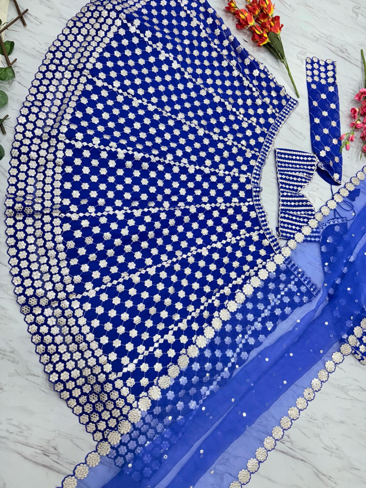 The lehenga includes heavy cancan and canvas with double inner covering, offering volume and perfect structure with a flair of 3.5 meters. The unstitched embroidered blouse showcases front and back work with full sleeves, while the organza dupatta adds a graceful finishing touch with its detailed embroidery and foil mirror design.