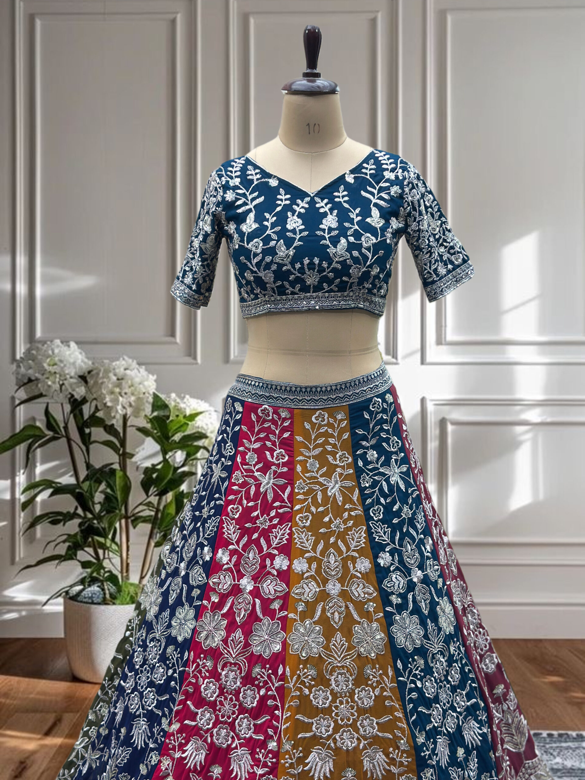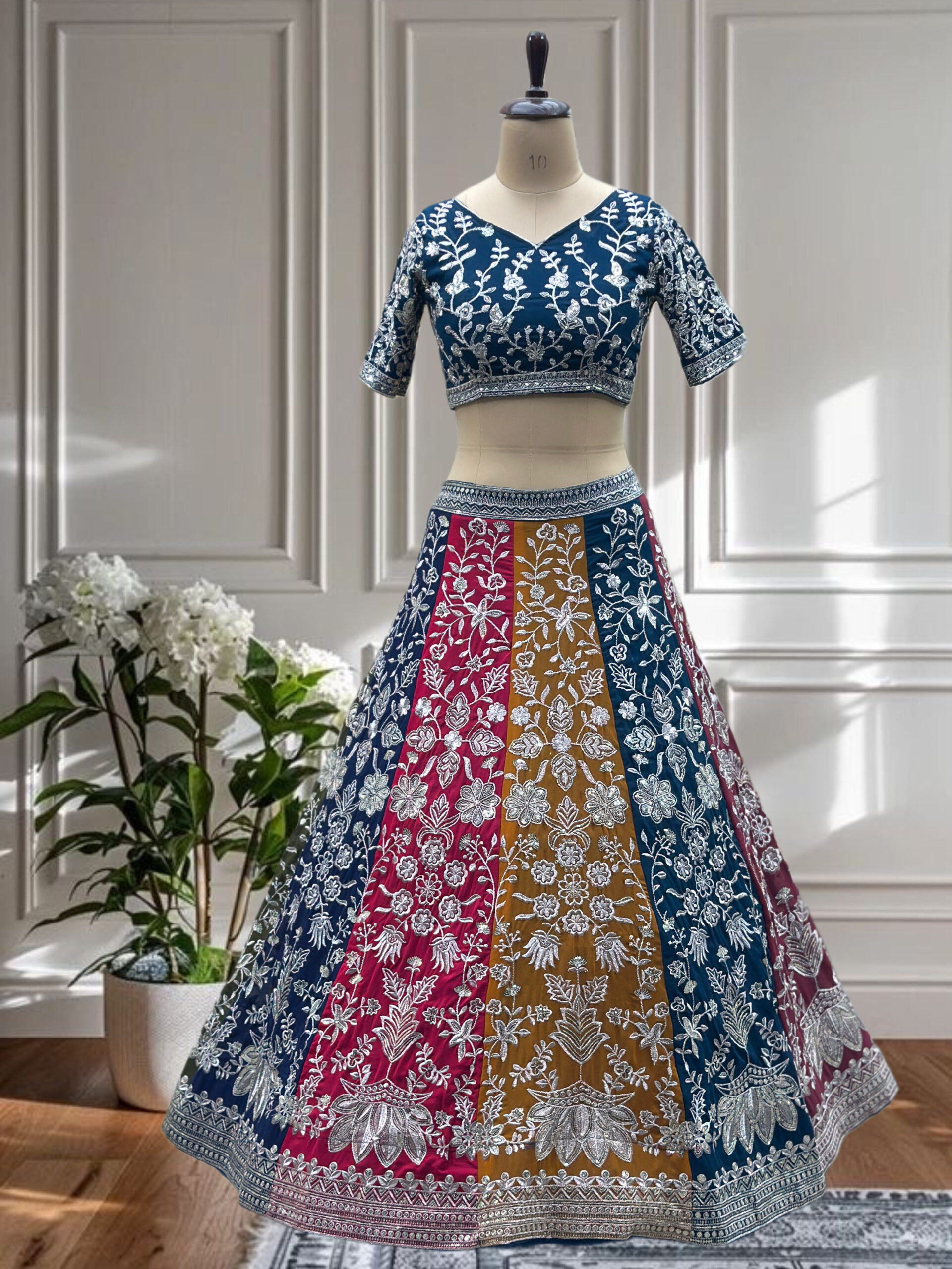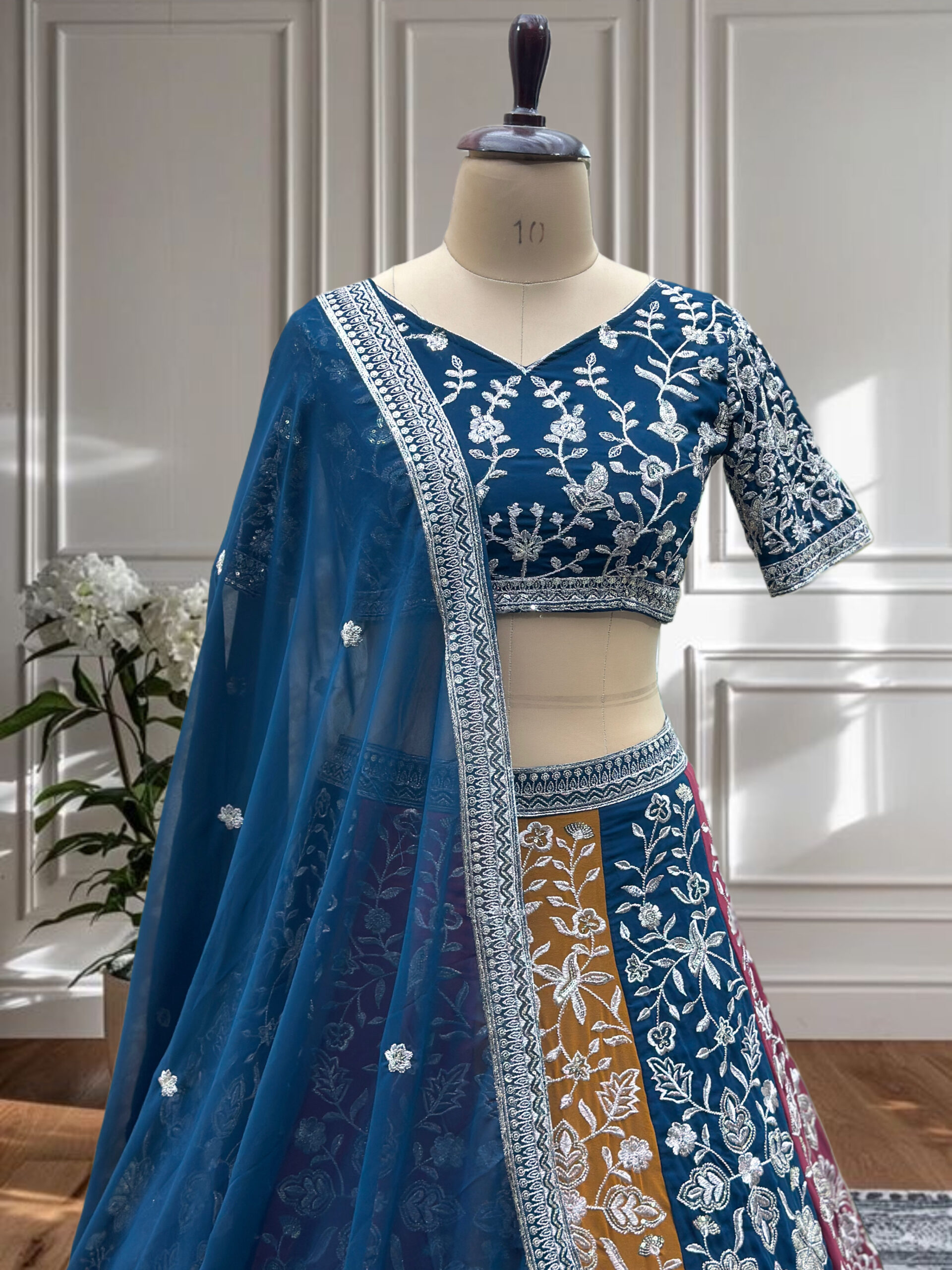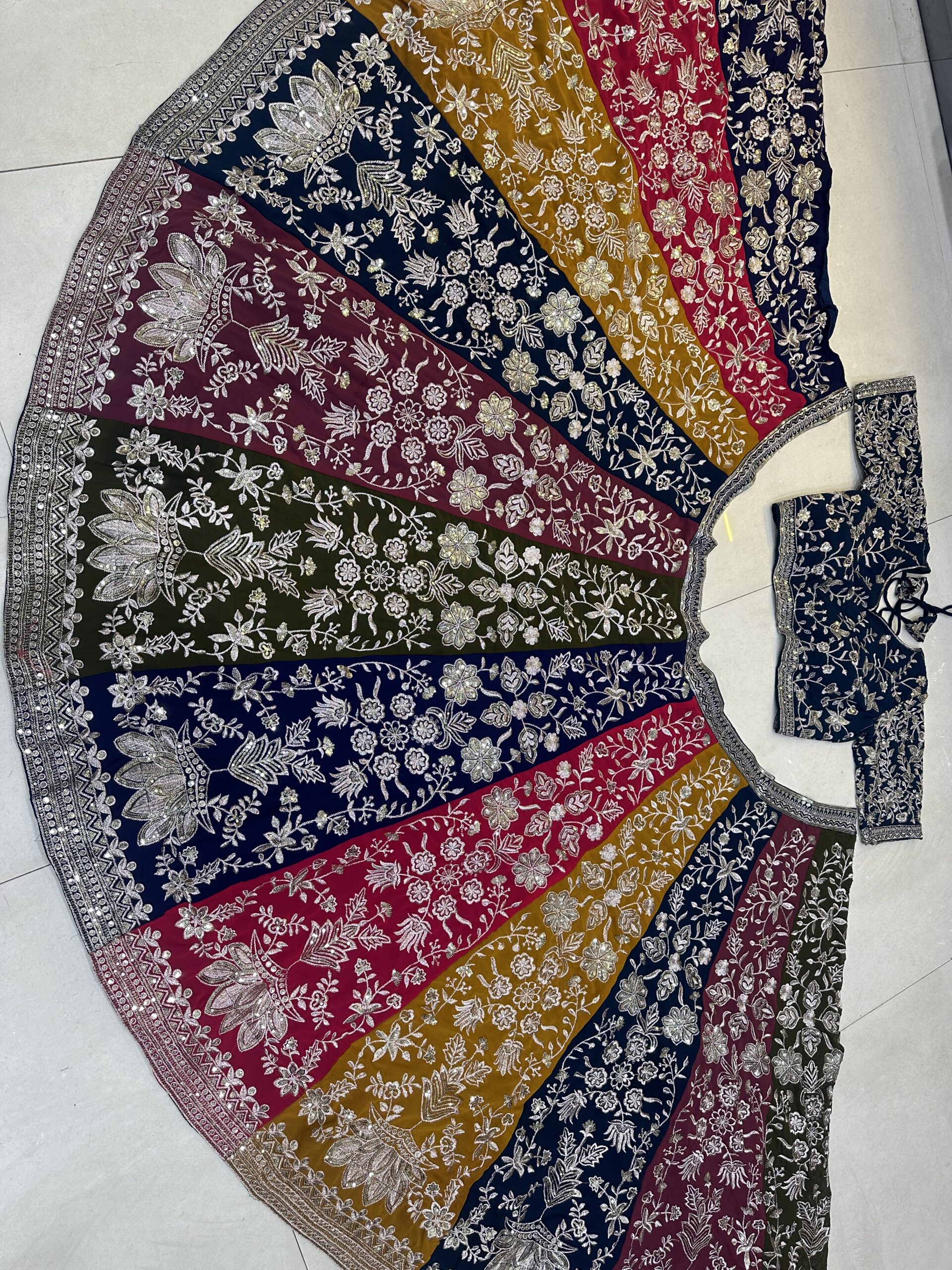 A stunning multi-panel designer lehenga choli crafted in faux georgette with rich sequins and zari embroidery. Featuring vibrant color-blocking and graceful flair, this set is perfect for festive and wedding celebrations.