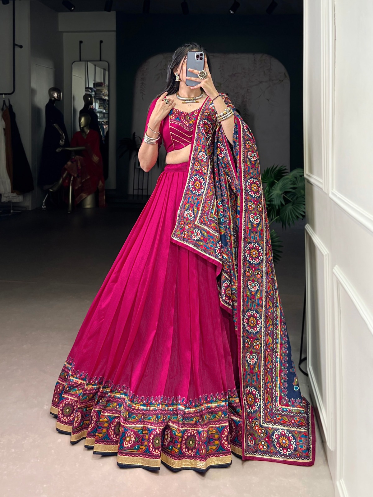 Bring grace, colors & tradition to your Garba nights! Step into the festive rhythm of Navratri with this Tassar Silk Lehenga Choli Set crafted with love and tradition. The Gamthi Print with embossed design & Gotta Patti lace touch-up makes it a perfect blend of elegance and ethnicity. Whether it’s Garba or Dandiya night, this outfit ensures you shine with every twirl.✨ Product Details:Lehenga (Stitched): Fabric: Premium Tassar Silk.Work: Gamthi Print with Embossed Design & Gotta Patti Lace Touch-Up.Waist: Fits up to 42″ (Drawstring + Zip Closure).Length: 41″ | Flair: 3.80 Meters.Inner: Comfortable Micro Crepe with Canvas for Volume.Blouse (Stitched):.Fabric: Tassar Silk.Work: Gamthi Print with Embossed Design & Gotta Patti Lace Touch-Up.Size: 38” (Margin up to 42”).Length: 15″ | Sleeve Length: 20″.Dupatta:.Fabric: Tassar Silk.Work: Gamthi Print with Gotta Patti Lace Touch-Up.Length: 2.40 Meters