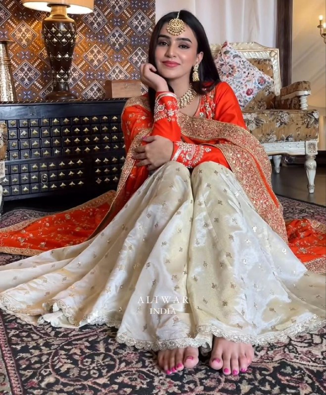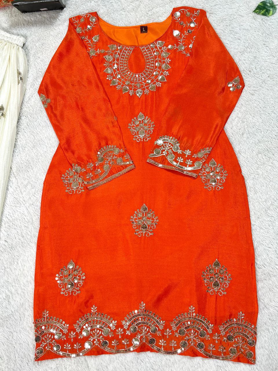is a vibrant orange suit set paired with an elegant garara and stylish dupatta. Crafted from premium chinnon fabric with shimmering sequins embroidery, this ensemble delivers festive charm, comfort, and a graceful silhouette.
