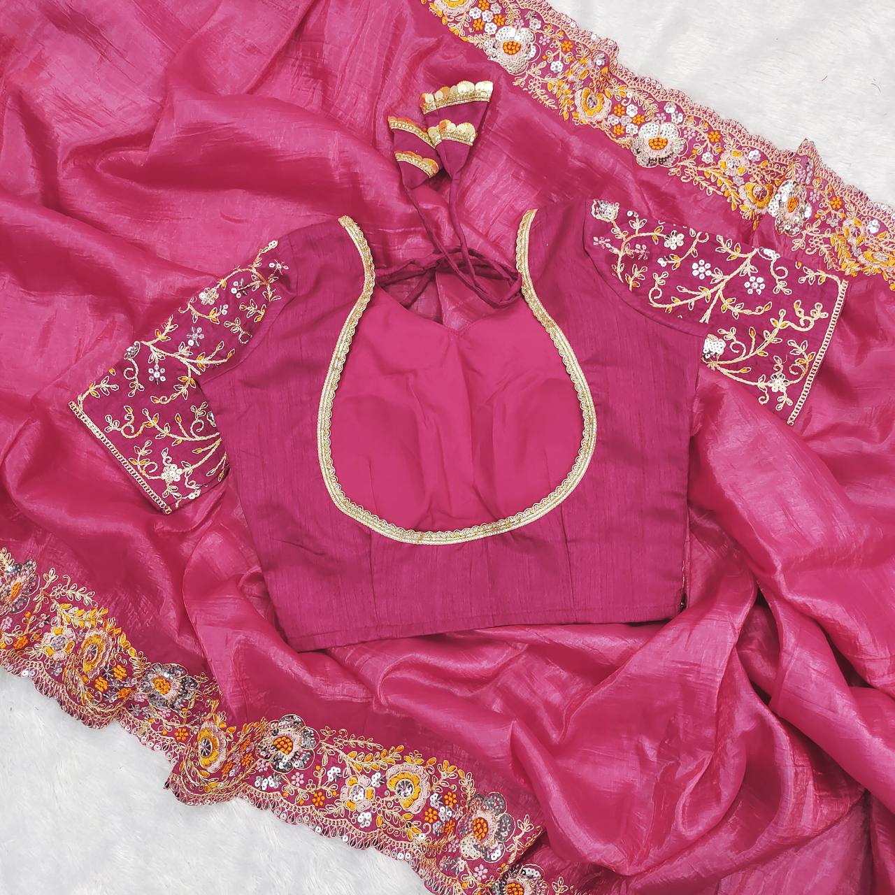 Turn heads with this Real Modelling Premium Gold Crush Saree, beautifully enhanced with heavy embroidery threads, coding, and sequins work. Paired with an unstitched embroidered blouse, this saree is ideal for weddings, parties, and festive occasions.