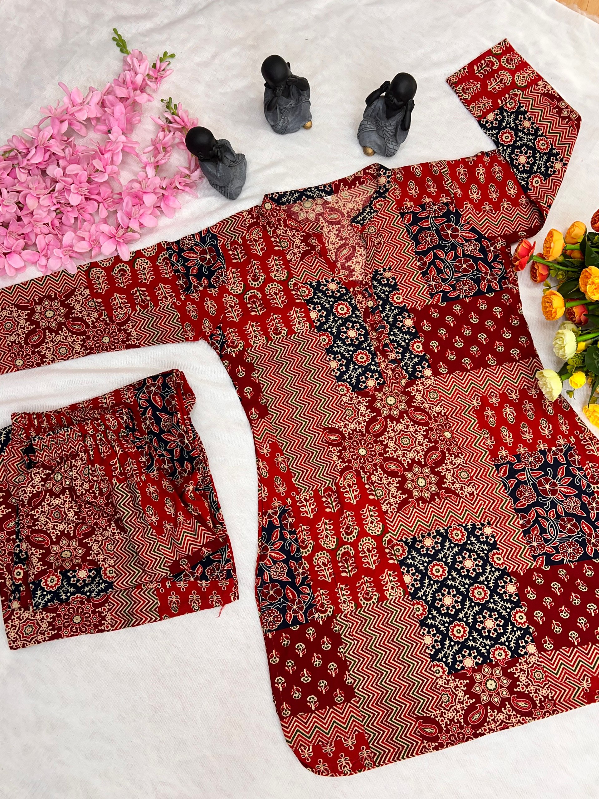This elegant printed co-ord is crafted from pure soft rayon cotton, offering breathable comfort and effortless style. The foil print detailing enhances the overall look, making it suitable for casual wear, outings, and everyday fashion.